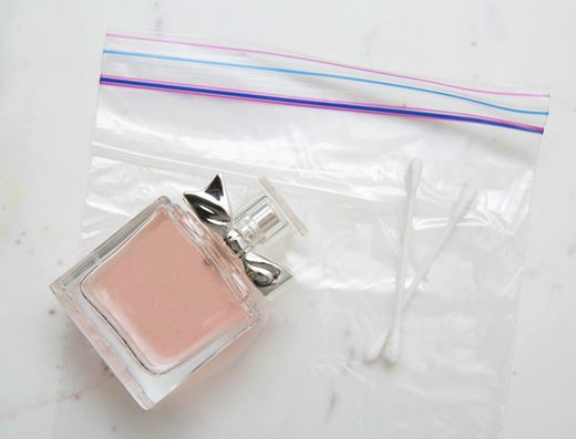 Xịt mùi hương nước hoa yêu thích của bạn lên bông tăm và cất giữ chúng trong một chiếc túi kín và để trong giỏ xách của bạn. Như thế thì bạn có thể nhanh chóng bôi lên một lớp nước hoa khi cần thiết. Rõ ràng là mang một túi bông tăm dễ dàng hơn là cả chai nước hoa trong túi xách rồi phải không?