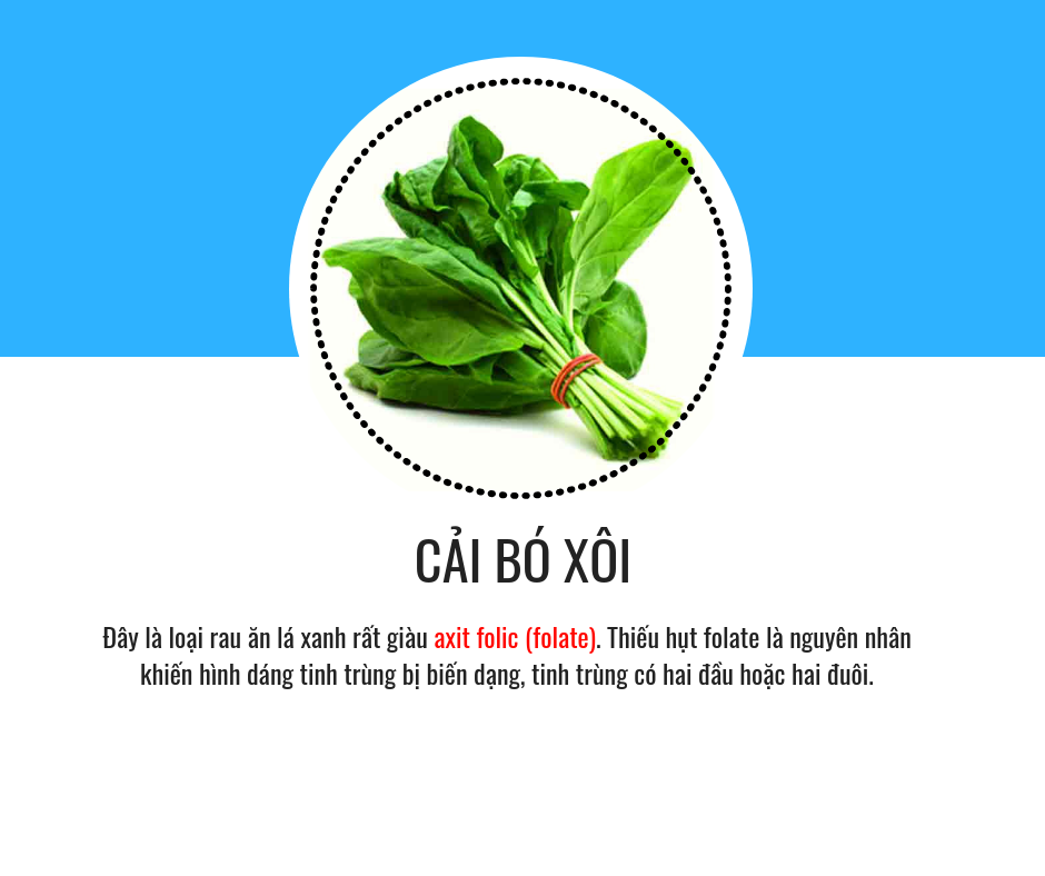 Một dưỡng chất khá quan trọng dành cho sức khỏe tình dục là folate, dưỡng chất này được tìm thấy trong cải bó xôi và 1 số loại thực phẩm khác như bông cải xanh, bắp cải, cải xoắn...