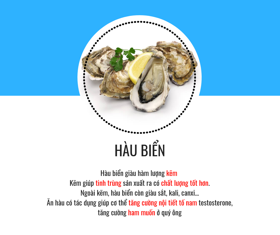 Hàu từ xưa đã được xem là phương pháp hàng đầu trong việc tăng cường sức khỏe sinh sản nam. Việc dùng con hàu trong bữa ăn hàng ngày là thực phẩm ưu tiên số một trong việc nâng cao đời sống sinh sản của đấng mày râu yếu sinh lý. Chỉ cần một con hày nhỏ cũng có thể đáp ứng được 15mg nhu cầu kẽm trong ngày. Thịt hàu có vị ngọt, hơi mặn, tính mát, không độc, tác dụng tráng dương, bổ tinh, tư âm, dưỡng huyết, ăn vào còn trị được chứng mất ngủ do nhiệt, người nóng khô khát hoa mắt, phụ nữ rối loạn tiền mãn kinh, phụ nữ sau sinh thiếu sữa thiếu máu ăn hàu rất tốt, nam giới có chứng di mộng tinh, hoạt tinh, yếu sinh lý, liệt dương, yếu sinh lý.