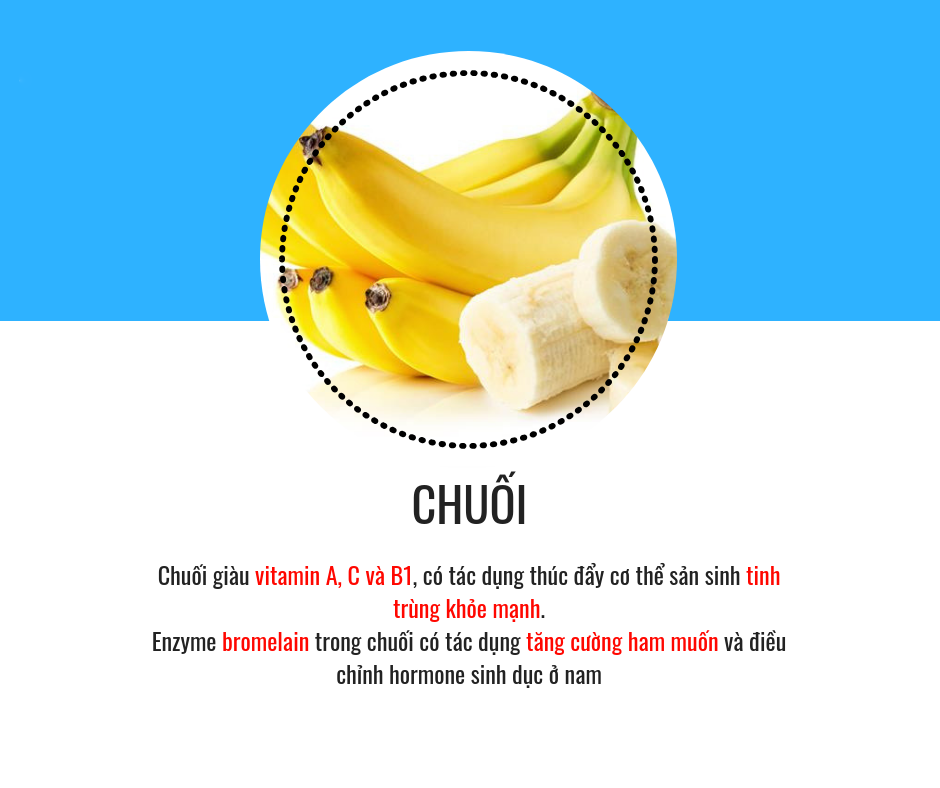 Chuối rất giàu vitamin B, dưỡng chất giúp duy trì năng lượng cao trong thời gian dài. Chuối còn là một trong những loại quả mùa hè dồi dào chất dinh dưỡng nhất. Enzyme bromelain trong chuối thúc đẩy ham muốn “yêu” của nam giới. Ngoài ra, chuối rất giàu kali, magiê và vitamin B, những khoáng chất giúp quý ông dẻo dai và bền bỉ hơn trong các cuộc yêu.