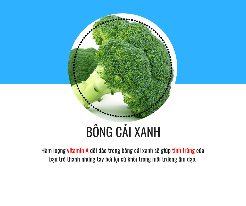Bông cải xanh (hay còn gọi là súp lơ xanh) được xem là “vua” của các loại rau vì nguồn thực phẩm rất giàu dinh dưỡng cho sức khỏe sinh nam giới. Trong bông cải xanh có chứa nhiều chất xơ, vitamin A, vitamin C, vitamin K, Axit folic (B9), Mangan, sắt và kali,… nó cũng chứa nhiều protein hơn hầu hết loại rau khác.