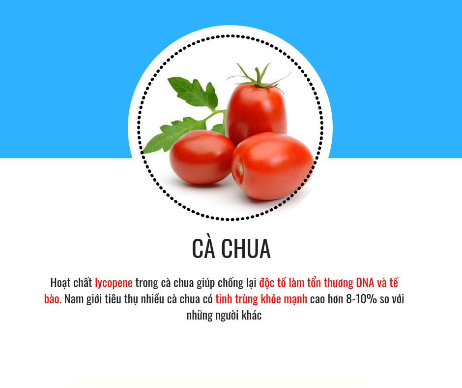 Các nghiên cứu khoa học trước đây từng xác nhận lycopene trong cà chua và một số trái cây màu đỏ khác có khả năng ngăn ngừa ung thư tiền liệt tuyến, bệnh phổ biến ở nam giới. Do vậy, đàn ông nên chú ý siêng ăn cà chua, đặc biệt là người ở tuổi trung niên. Lycopene có trong cà chua có ảnh hưởng tới sinh sản, tác động đến khả năng sinh sản ở nam giới, có thể tăng mức độ tinh trùng ở những người đàn ông giúp tăng cường sinh lý nam giới.